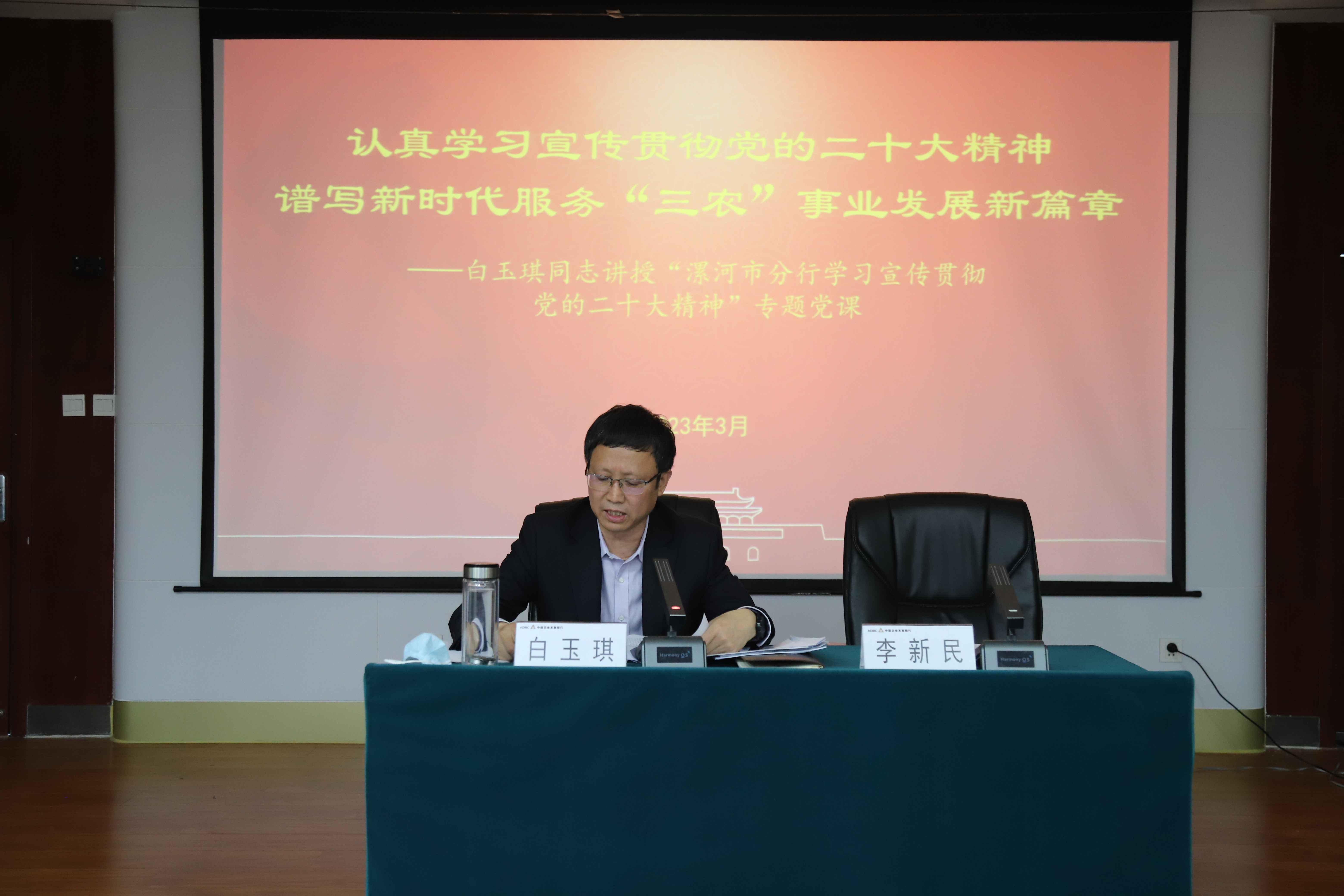 金融文化参讯-河南(曹鹏飞)为持续深入学习宣传贯彻党的二十大精神,教育引导全行党员干部“学思践悟”精神内涵要义。3月30日,农发行漯河市分行党委书记、行长白玉琪以“认真学习宣传贯彻党的二十大精神,谱写新时代服务“三农”事业发展新篇章”为题,为全行党员干部讲授专题党课。