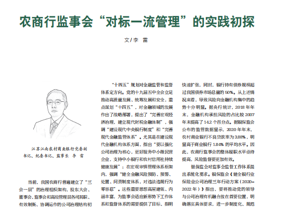 完善的公司治理对农商行的改革发展具有重要意义,它是督促其坚守支农支小战略定位的机制保障,也是维护稳健经营、实现高质量发展的核心。不仅银保监会始终把完善公司治理作为金融改革的重中之重,多次组织召开会议研究公司治理工作,成立专门负责公司治理监管的功能监管部门,出台一系列公司治理监管制度文件,全面规范各治理主体行为。作为农商行,其监事会更应聚焦银行、保险业的“公司治理三年行动方案”,围绕“党的领导、内外联动、重点突出”三个方面,在保持原有战略、风险、财务、履职、内控合规、重大经营活动“六大监督”特色的基础上,通过对标一流管理行动提炼上市银行优秀履职实践,进一步做实监督工作,增强履职实效。