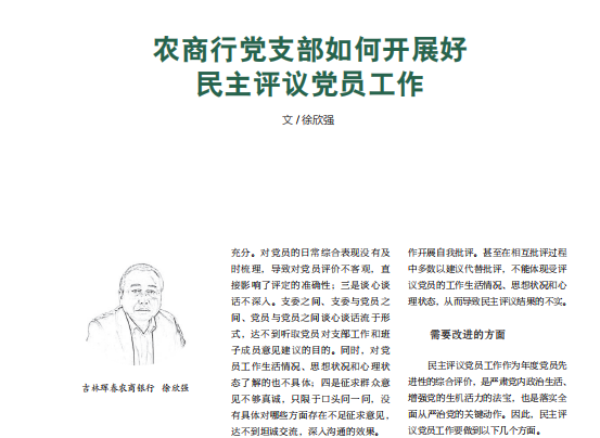 民主评议党员是加强党的政治建设的一项重要经常性制度。农商行作为党领导下的金融企业,做好民主评议党员工作,是全面从严治党,加强党员教育、管理和监督的有效措施;是在业务经营高质量发展阶段中提高党组织战斗力、增强党员队伍凝聚力的重要组成部分。但在实际工作中,评议存在一些问题和短板,如果加以解决,将会激励广大党员强化党的观念、提高党性修养,成为一名合格党员。