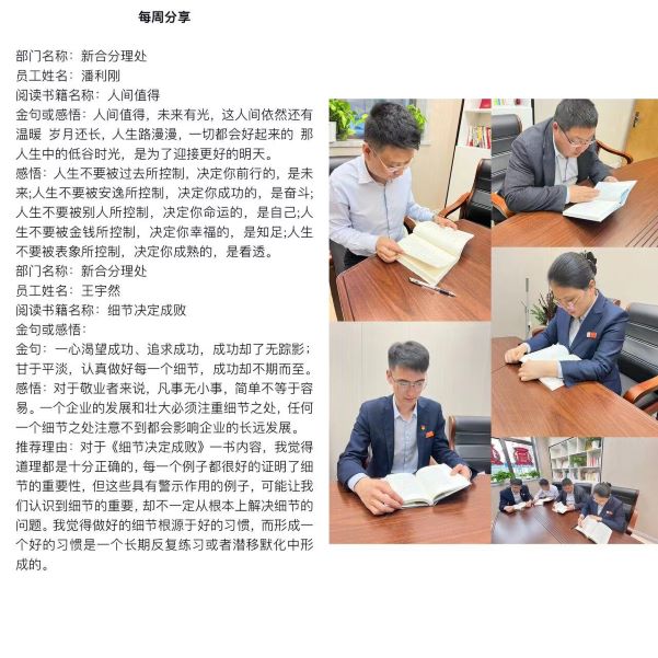 二是阶段推进,点面结合。本次读书月采用“日打卡、周分享、月交流”的活动形式,以机关党支部和营业网点为单位,员工每天至少阅读30分钟并打卡,以自律促学风;每周分享一名员工的书目经典语录和读书感悟,以学思促共鸣;活动月结束,组织读书分享会,共同交流所学所感所悟,以书香凝智慧。
