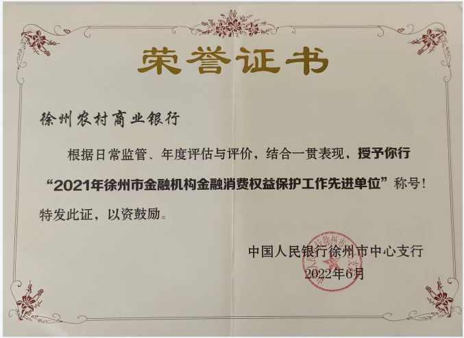 6月2日,徐州农商银行荣获“2021年徐州市金融机构金融消费权益保护工作先进单位”称号。这是徐州农商银行开业以来首次获此荣誉。徐州农商银行在人民银行消保部门的领导下,通过完善机制建设、强化宣传教育、提高工作效能等举措,切实提升消费者权益保护工作能力与水平。