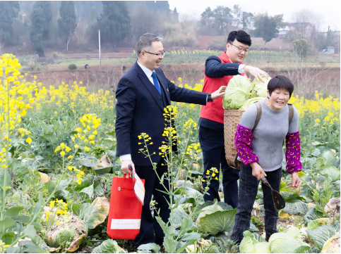 2023 年 5 月,四川内江农商银行召开 2023 年金融支持乡村振兴工作会,对全年“三农”工作进行安排部署,制定方案,明确目标、流程和时限,由支行行长带队在辖内开展走访,对当地农户和商户进行信用状况评估,同时,召开金融政策宣讲会,把政策讲清,把产品说透,将金融服务送到乡村最前沿。图为客户经理在田里了解农户蔬菜种植情况。