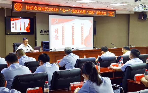 金融文化参讯-湖南(汤甜甜 秦文强)为隆重庆祝中国共产党建党102周年,深入开展学习贯彻习近平新时代中国特色社会主义思想主题教育,7月1日,桂阳农商银行召开了2023年“七一”党建工作暨“双优”表彰大会,会议由党委副书记、行长胡燕林主持。总行党委班子成员、协理员、高管、党支部支委成员、预备党员、机关部室全体党员、优秀共产党员、优秀党务工作者等80余人参加了本次会议。