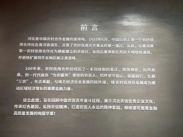 不忘历史才能开创未来。一部农信发展史,就是在中国共产党领导下的廊坊红色金融奋进史、发展史,承载着丰厚的革命历史、生动的革命事迹、宝贵的革命精神和优良的革命传统,在百年金融发展史中留下了极为悠久、极为珍贵的历史印记。下一步,廊坊农信将继续坚守百年为民初心,赓续红色农信基因,践行金融报国使命,充分发挥展览馆的宣传教育功能,真正把“农信社发源地展览馆”打造成为铭记农信百年奋斗征程、彰显农信深厚历史文化、凝聚奋进力量的精神家园,感召和激励广大干部职工将“百年农信”精神内化于心、外化于行,敢于斗争,善于斗争,以更加昂扬的斗志、更加务实的作风奋力谱写好中国式现代化河北篇章。