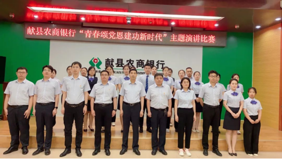 金融文化参讯-河北(孙宏伟)为深入学习习近平新时代中国特色社会主义思想,推动主题教育走深走实,推进献县农商银行高质量发展,7月6日晚,献县农商银行举行“青春颂党恩 建功新时代”主题演讲比赛,来自各部室、各支行的22名青年员工参加了比赛。党委班子成员张永利、王龙军、张建彪、韩立成、工会副主席张红星和部分党支部书记担任评委。